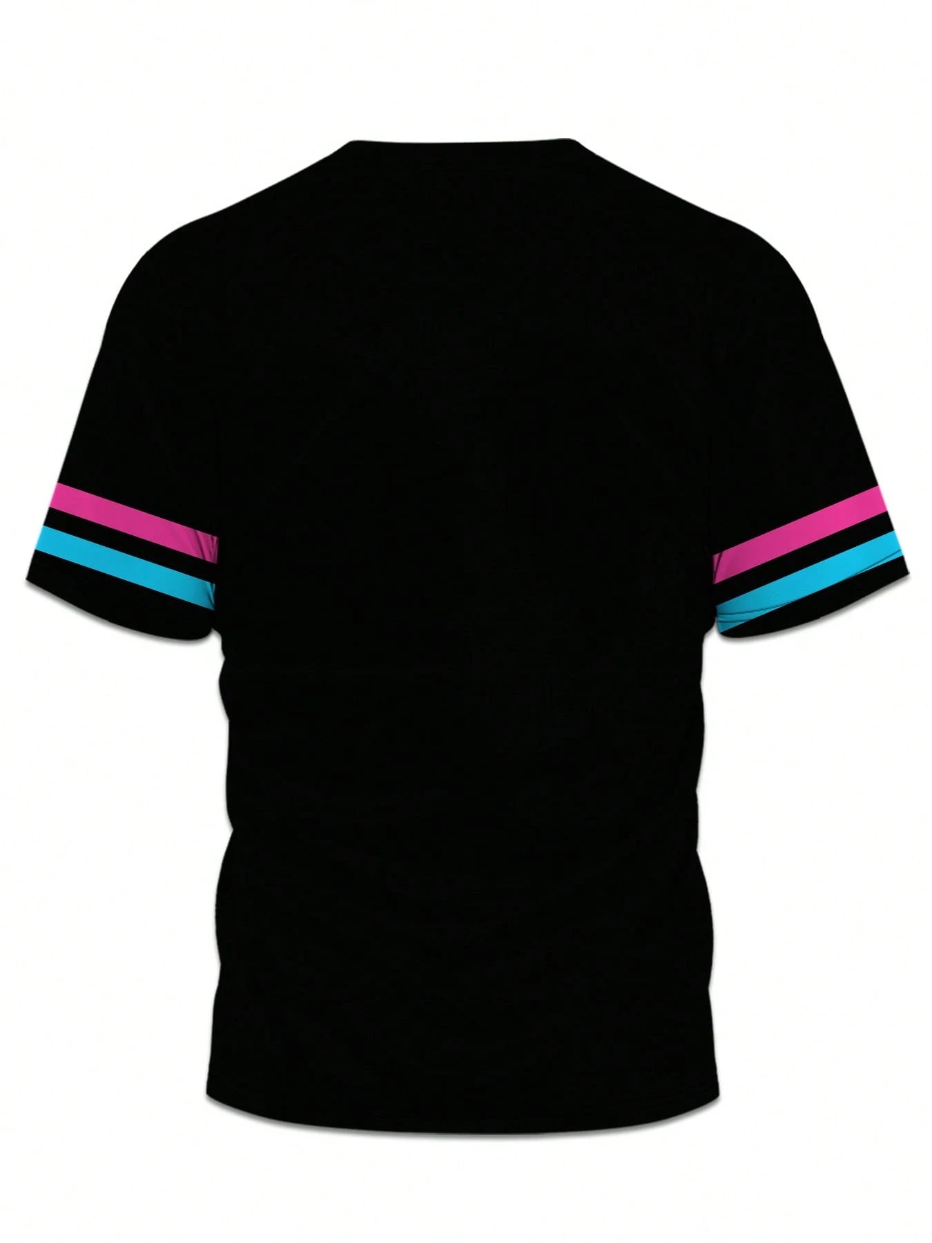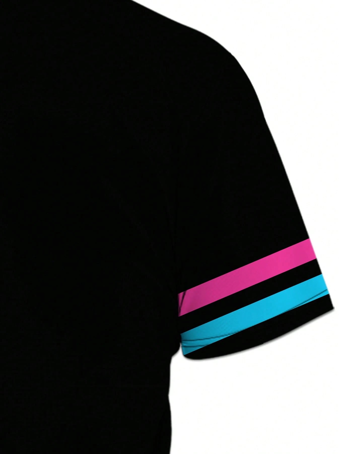 Stap stijlvol de zomer in met deze opvallende 2-delige heren set! De combinatie van een rondhals T-shirt met korte mouwen en bijpassende shorts brengt een sportieve én trendy look. Het Miami-letter ontwerp en de zwart-roze-blauw gestreepte details zorgen voor een frisse, urban uitstraling die perfect past bij casual dagen, festivals of relaxte strandwandelingen.