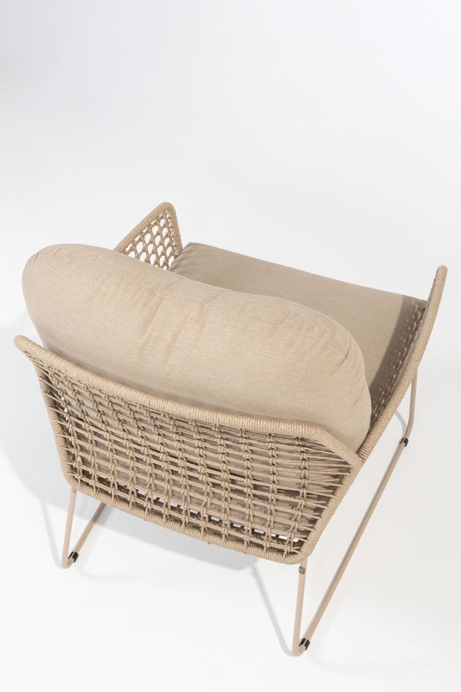 Het strakke, minimalistische ontwerp past moeiteloos in diverse buitenomgevingen, van een modern terras tot een sfeervolle tuin. Het frame van de loungeset is vervaardigd uit stevig roestvrij staal (RVS) in de zachte tint latte, terwijl het zitgedeelte is afgewerkt met duurzaam zandkleurig rope. Deze materialen zijn niet alleen prachtig om te zien, maar ook volledig weerbestendig en onderhoudsarm.