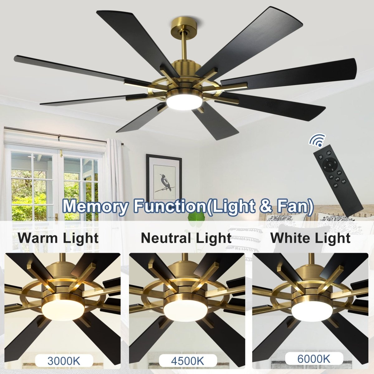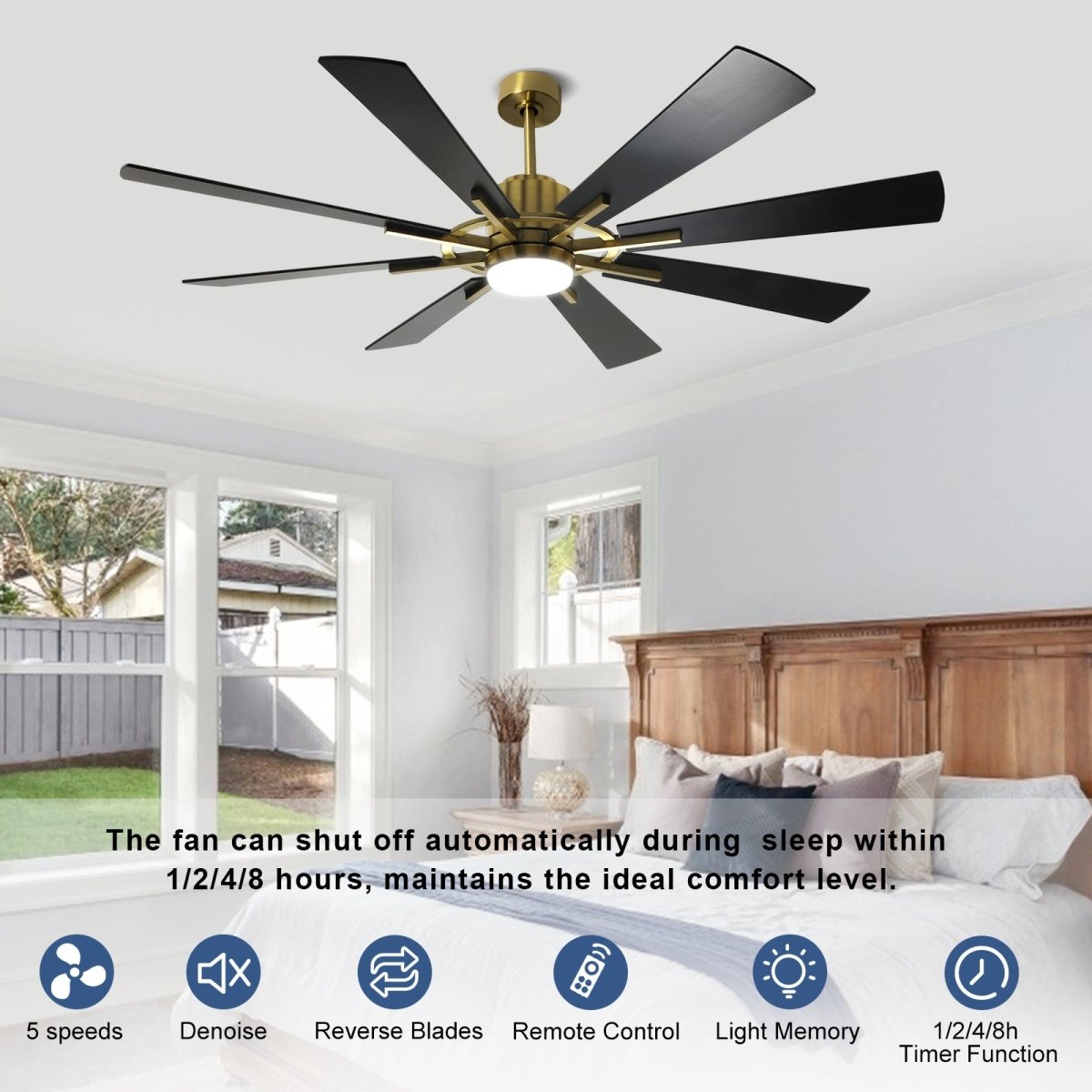 Alle functies van deze plafondlamp ventilator zijn eenvoudig te bedienen via de meegeleverde afstandsbediening of via een handige app. Je kunt de 5 ventilatorsnelheden, lichtinstellingen, en timerfuncties (1/2/4/8 uur) naar wens instellen. Dankzij de geheugenfunctie onthoudt de ventilator je laatste instellingen, zodat je altijd terugkomt op je favoriete standen.