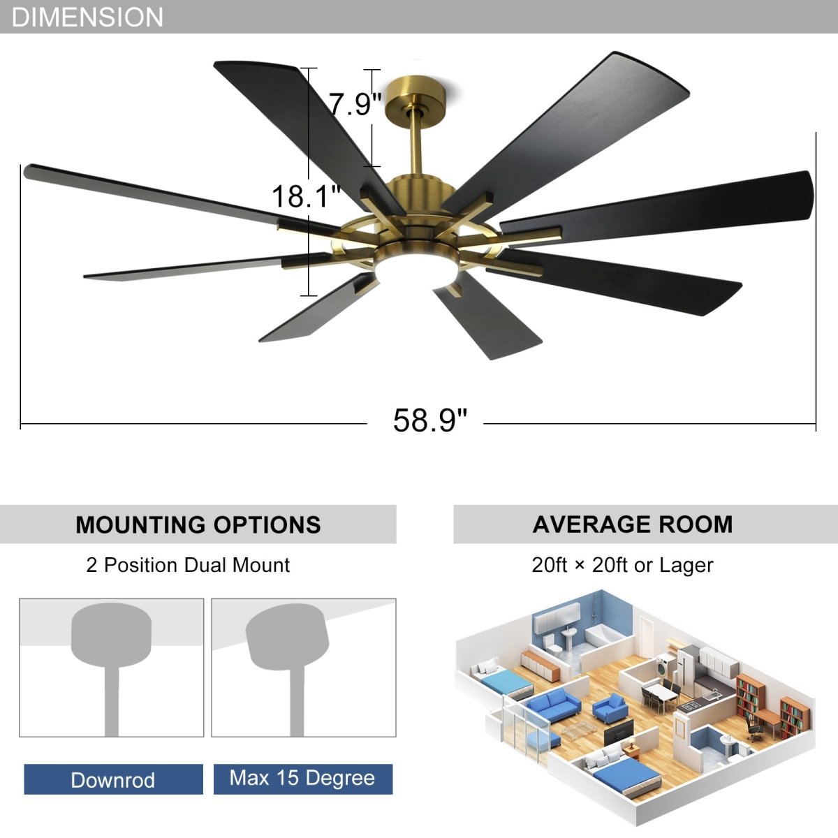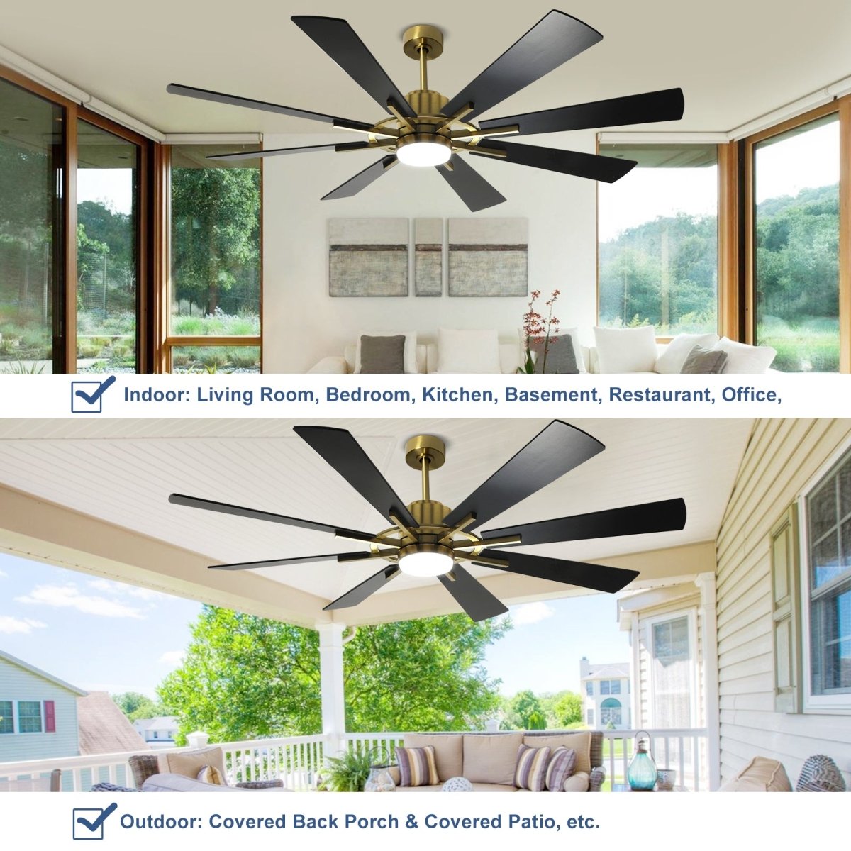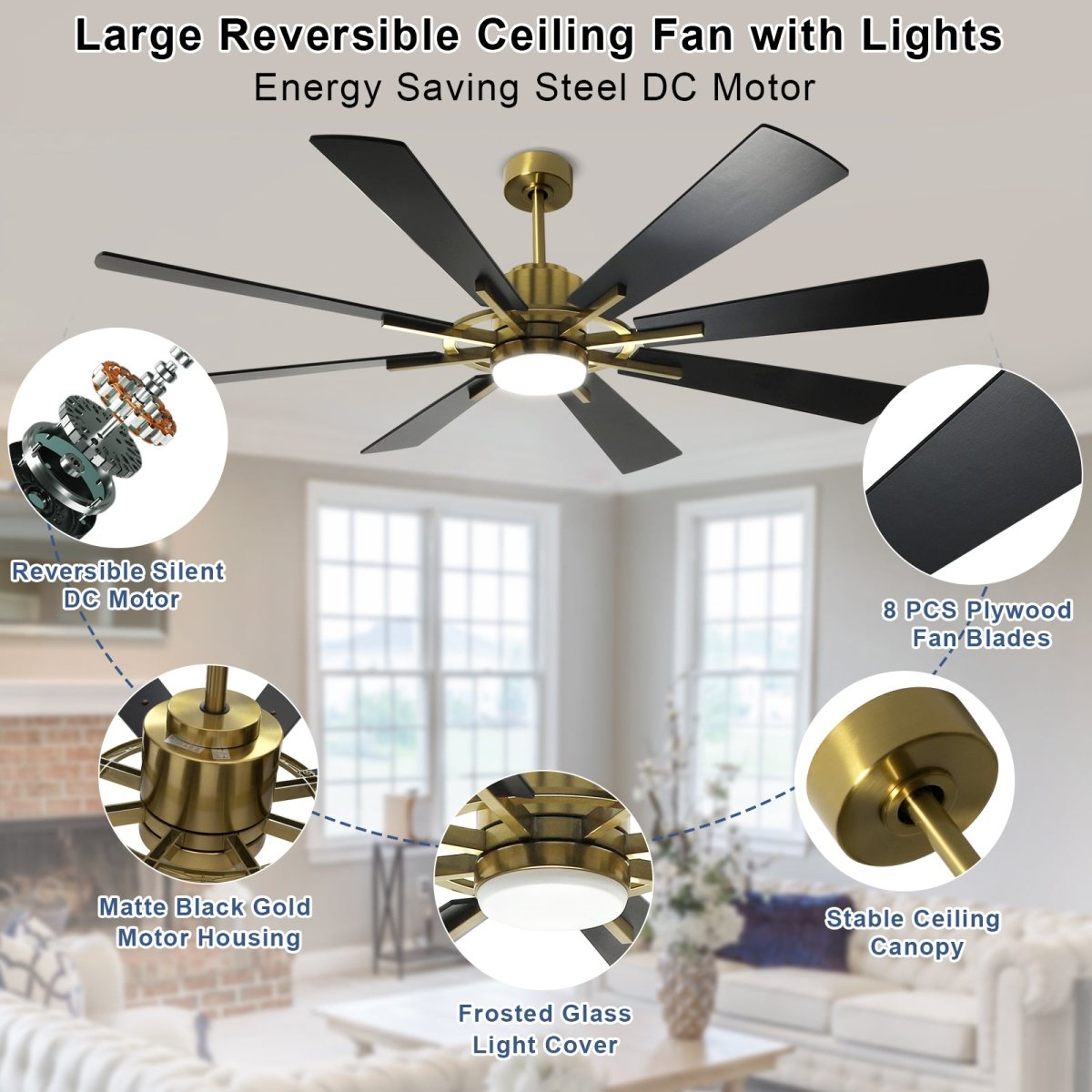 Plafondventilator Depuley 60” – Met Lamp – Zwart Goud – 8 Bladen – Stille DC Motor – Afstandsbediening & App – Dimbaar